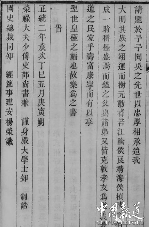 楊榮文中提到的清平伯吳成,《明史》有記載,六家畈《吳氏族譜》上記為“三世祖吳興七之子,明宣宗時(shí)以功封清平伯予世券,后進(jìn)侯,卒贈(zèng)渠國(guó)公,謚壯勇”。1914年第十次續(xù)修譜時(shí)任總理纂修的吳兆棨,是原淮軍“華”字營(yíng)統(tǒng)領(lǐng)吳毓芬的第三子,他在吳成姓名后加注,“壯勇公一支聯(lián)入本宗無(wú)不可考,其世次亦頗有素亂,今按《明史》更正而輩行名諱與本宗室疑甚多,不并列,故撮記如右”。相關(guān)情況,還需要進(jìn)一步考證。