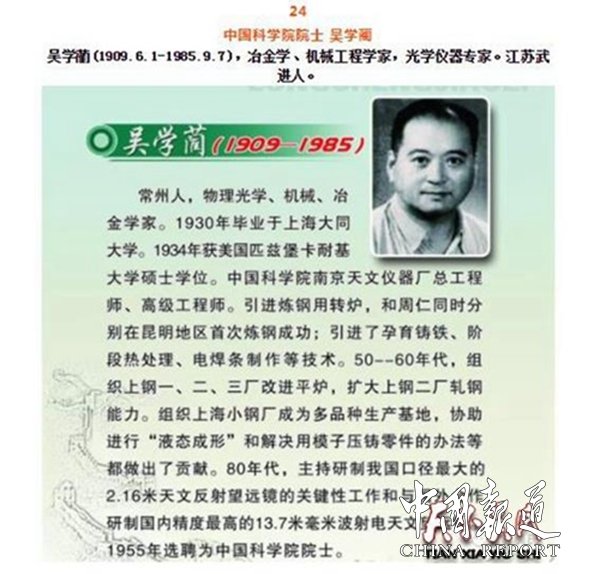 024吳學(xué)藺(1909.6.1-1985.9.7),冶金學(xué)、機(jī)械工程學(xué)家,光學(xué)儀器專家,江蘇武進(jìn)(今常州)人,中國科學(xué)院院士,中國科學(xué)院南京天文儀器廠總工程師、高級工程師。