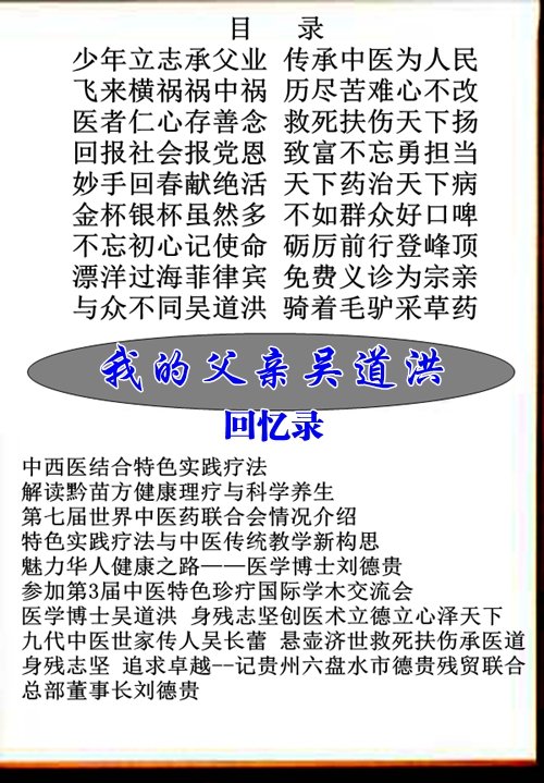 貴州智燊健康管理有限公司 貴州黔心苗健方健康管理有限公司 六盤水黔苗方康養(yǎng)中心吳恒最后表示,繼承父親的遺訓(xùn)(人存良心天照看。真材實(shí)料,餓死也不坑害人),將中醫(yī)發(fā)揚(yáng)光大!目前我父親的補(bǔ)腎壯陽酒即將投產(chǎn),以及《我的父親吳道洪》回憶錄由作家吳蜀豐撰寫即將出版問世,本書內(nèi)容淺顯易懂,是一本不可多得的勵(lì)志故事,特別是對(duì)從醫(yī)者將受益匪淺。