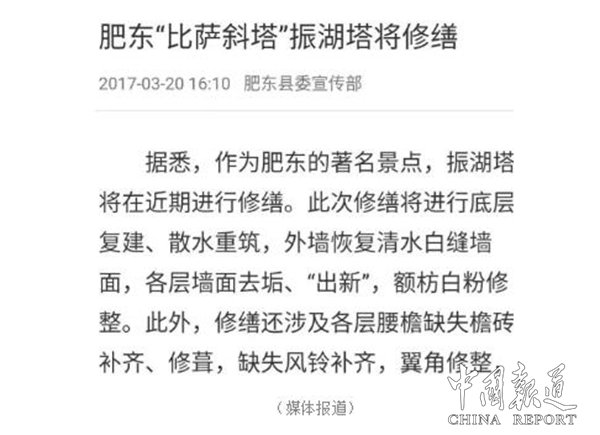 塔有點(diǎn)斜。肥東縣有關(guān)方面在2017年3月20日發(fā)表文章《肥東“比薩斜塔”振湖塔將修建》,文中,“工作人員表示,振湖塔發(fā)生傾斜是上世紀(jì)六七十年代因村民在塔邊挖深坑所造成的”。上世紀(jì)七十年代初至1982年春節(jié),我在老家生活。老家對此有不一樣的解釋,說抗日戰(zhàn)爭期間,日本鬼子飛機(jī)準(zhǔn)備轟炸不遠(yuǎn)處巢湖姥山島上的文峰塔,飛到這里,誤將此塔當(dāng)作文峰塔,投下炸彈,將塔炸斜了。故事不知真假,塔身斜是真的,好在經(jīng)過政府修繕,看不出斜的樣子。鎮(zhèn)湖塔也在1998年5月4日,被公布為安徽省文物保護(hù)單位。