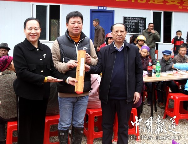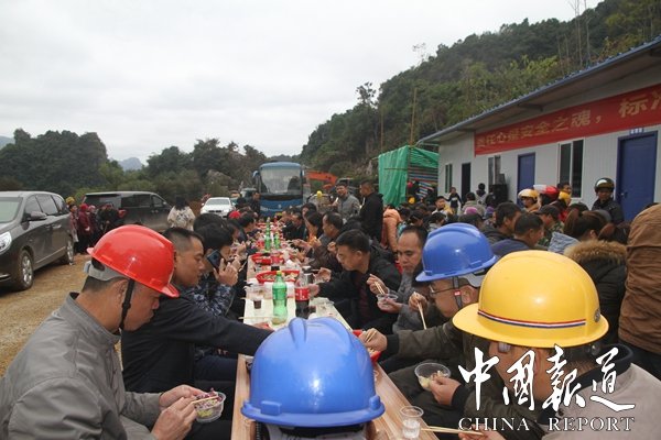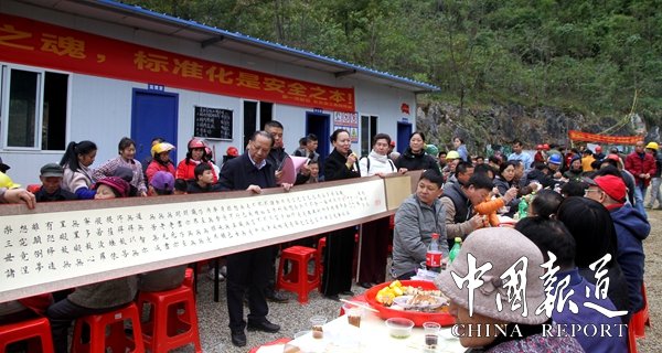 11月28日,考察團(tuán)成員來(lái)到公司正在建設(shè)的名勝景區(qū)長(zhǎng)樂(lè)宮時(shí),受到公司和當(dāng)?shù)馗刹咳罕姷臒崃覛g迎,當(dāng)?shù)厝罕娪脡炎逵e最高規(guī)格壯族銅鼓陣歡迎他們的到來(lái),長(zhǎng)樂(lè)宮景區(qū)大門前,銅鼓聲、鞭炮聲不斷,考察團(tuán)認(rèn)真了解景區(qū)開(kāi)發(fā)規(guī)劃、目標(biāo),還參加公司舉行的長(zhǎng)樂(lè)宮洞口洞門立門儀式,中午,考察組成員一起與公司員工和當(dāng)?shù)厝罕姽?00多人共進(jìn)當(dāng)?shù)貕炎逄厣拈L(zhǎng)桌宴午餐,王淑萍院長(zhǎng)代表寫經(jīng)院給第一灣股份公司贈(zèng)送珍貴的長(zhǎng)達(dá)6米的經(jīng)典書(shū)法經(jīng)文。
