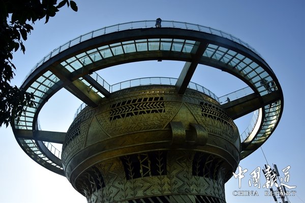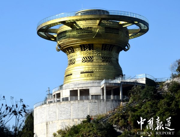 東蘭第一灣玻璃銅鼓觀景臺,以銅鼓為元素、總投資8000萬元,建在紅水河第一灣岸邊海拔702米高的山峰上。觀景臺采用全玻璃環(huán)繞結(jié)構(gòu),銅鼓高21.5米,銅鼓最大直徑為21.5米,玻璃棧道直徑為35.5米,站在銅鼓玻璃棧道上,可一覽“紅水河第一灣”全景。云煙深處不見人,瑤池空余銅鼓響。東蘭第一灣玻璃銅鼓觀景臺背靠群山,遠(yuǎn)眺絕壁,山路九曲,靈水一盈,仙氣縈繞,云煙聚散,可謂九重天上第一宮。