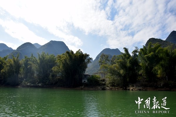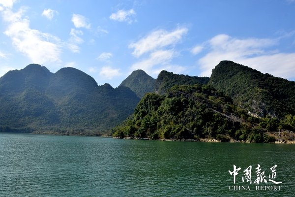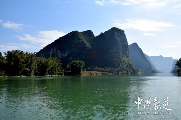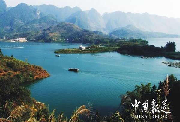 廣西人都知道紅水河是廣西的母親河。紅水河以磅礴的氣勢醒目地鐫刻在廣西遼闊的版圖上,全長638公里,流域面積3.32萬平方公里,水量大,落差大,蘊(yùn)藏著巨大的水能資源。國家先后在紅水河修建了十個梯級水電站猶如十顆光芒閃耀的珍珠鑲在紅水河這條巨大的金鏈子上,共同展示著廣西獨(dú)特而豐富的水能資源,而在長長的紅水河中,最為引人注目的,是其穿過東蘭縣境內(nèi)的長達(dá)115公里的河段。這115公里長的河段格外壯美,人稱紅水河“百里畫廊”,那如大地震裂的溝壑彎彎曲曲,如斜著抖動的彩帶飄飄揚(yáng)揚(yáng),其不僅以富饒的物產(chǎn)養(yǎng)育著兩岸的人民,還將自己與生俱來的迷人風(fēng)光集中呈現(xiàn)在這里的兩岸。坡豪湖是東蘭境內(nèi)眾多迷人風(fēng)光中最美的一處。如果把紅水河比作一條神奇的巨龍,那么美麗的坡豪湖就這條巨龍用自己富有靈性的金爪在東蘭的大地上精心勾畫出來的一處人間仙境。