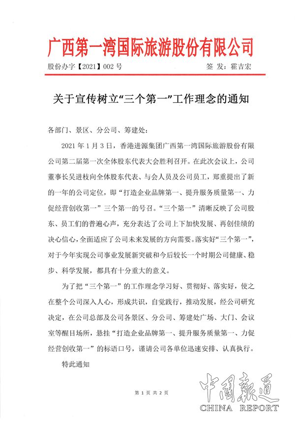 中國報道訊(通訊員覃源)2021年1月3日,香港進(jìn)源集團廣西第一灣國際旅游股份有限公司第二屆第一次全體股東代表大會勝利召開。