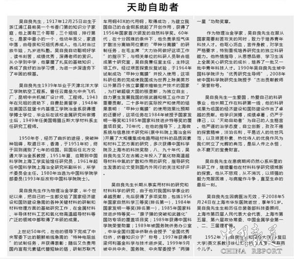 吳自良以淵博的學(xué)識,嚴(yán)謹(jǐn)?shù)闹螌W(xué)態(tài)度,平易近人的作風(fēng),幾十年如一日、不倦地耕耘在科研第一線,切實為祖國建設(shè)作貢獻(xiàn),而深受大家的尊敬。(中華人民共和國國防部)