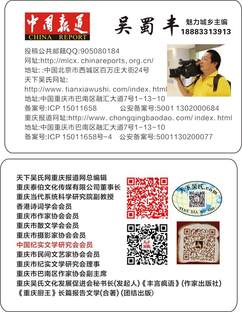 【作者簡(jiǎn)介】吳蜀豐,原名吳陶清,男,重慶當(dāng)代系統(tǒng)科學(xué)研究院副研究員,生于1963年10月,祖籍原四川省豐都縣樹(shù)人區(qū)開(kāi)峰鄉(xiāng)雙紅村九社吳家灣。中國(guó)報(bào)道網(wǎng)《魅力城鄉(xiāng)》主編。已發(fā)表小說(shuō)、散文、通訊、專(zhuān)訪等題材600余萬(wàn)字。