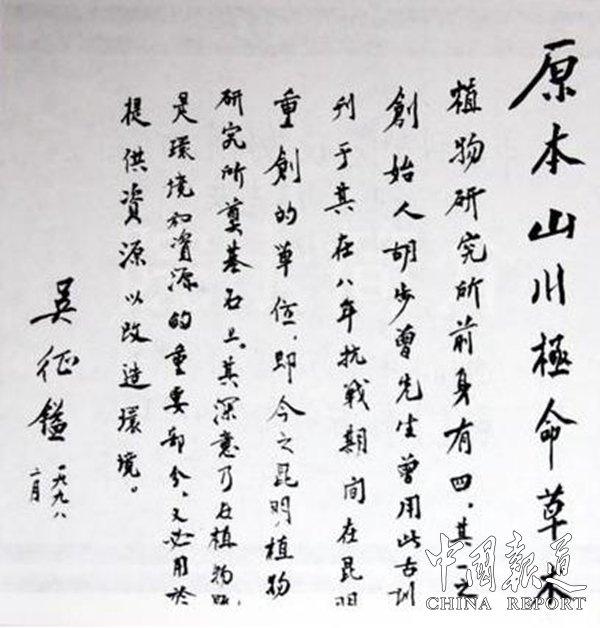 1999年8月,吳征鎰給朱镕基總理寫了一封信。他在信中建議:“十分有必要盡快建立云南野生種質(zhì)資源庫,對其中有近期開發(fā)價值的野生種質(zhì)資源進行遺傳背景的分析研究,提取DNA進行分類保存,在此基礎(chǔ)上進行合理開發(fā)。2006年,90歲高齡的吳征鎰率領(lǐng)弟子著手整理研究中國清代著名的植物學(xué)專著《植物名實圖考》及其《長編》,開啟了中國植物考據(jù)學(xué)研究的新篇。