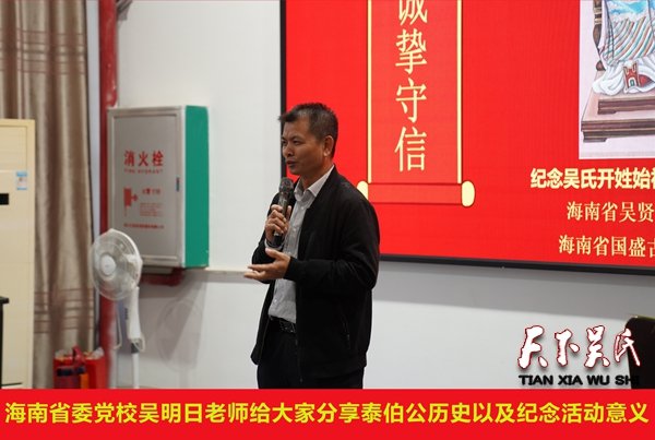 本次紀(jì)念活動(dòng)由海南省吳賢秀文化教育基金會(huì)秘書長吳開河主持。活動(dòng)開始由承辦方國盛紅木董事長,海南省古典家具協(xié)會(huì)會(huì)長吳名光致歡迎辭,他回顧了父輩為海南吳氏事業(yè)所做的無私貢獻(xiàn),同時(shí)也表達(dá)再忙也不忘祖業(yè),借此機(jī)會(huì)學(xué)習(xí)先輩至德文化,激勵(lì)后人弘揚(yáng)至德精神。海南省吳賢秀文化教育基金會(huì)永遠(yuǎn)名譽(yù)理事長吳亞榮的講話,是本次活動(dòng)的重要內(nèi)容,他強(qiáng)調(diào)我們分布在全世界的吳氏宗親,都是泰伯的子孫,泰伯謙讓開拓的至德精神被歷代皇帝和孔圣人稱圣,并把至德精神作為吳文化研究學(xué)習(xí)傳承,是我們吳氏的巨大精神財(cái)富,泰伯公是我們的光榮驕傲和自豪。我們要不忘祖恩,牢記祖德,振興祖業(yè)。要學(xué)習(xí)學(xué)習(xí)再學(xué)習(xí),團(tuán)結(jié)團(tuán)結(jié)再團(tuán)結(jié),努力努力再努力,為實(shí)現(xiàn)中國偉大復(fù)興為加快海南自由貿(mào)易港建設(shè),為弘揚(yáng)至德精神振興吳氏共同事業(yè)而努力奮斗!基金會(huì)副理事長吳坤海講話,他對去年工作的總結(jié)回顧,今年工作重點(diǎn)也做了概括,表達(dá)了積極創(chuàng)新,腳踏實(shí)地的務(wù)實(shí)精神。原儋州市政協(xié)主席吳清毅宗長德高望重,多年來對我們各宗親機(jī)構(gòu)給予支持指導(dǎo),他強(qiáng)調(diào)要將至德精神與實(shí)際工作結(jié)合起來,四個(gè)弘揚(yáng)與四個(gè)結(jié)合的博得大家陣陣掌聲。之后,為加深宗親們對泰伯歷史以及至德文化的內(nèi)容的了解,由海南黨校吳明日老師給大家做演示了講解,并全場對泰伯公的儀像進(jìn)行三叩首以示紀(jì)念?;顒?dòng)最后,大家在國盛產(chǎn)業(yè)園的餐廳內(nèi)聚餐,宗親們活動(dòng)前參觀了各類名貴紅木家具,品嘗到別具一格的花梨樹下走地雞等美食,其樂融融,大家愿意共同攜起手來,將學(xué)習(xí)至德文化,弘揚(yáng)至德精神,為振興祖業(yè),實(shí)現(xiàn)中國夢,團(tuán)結(jié)起來,在加快海南自貿(mào)港的建設(shè)中做出應(yīng)有貢獻(xiàn)。