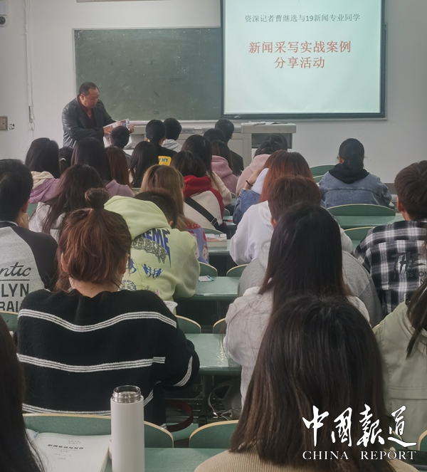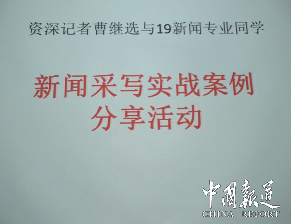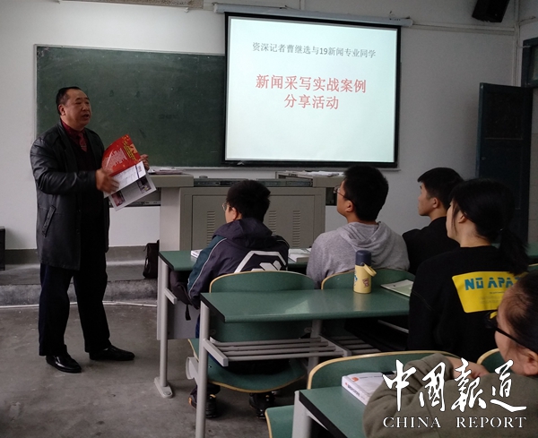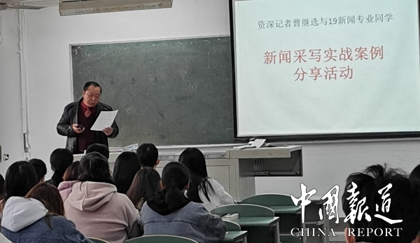 據(jù)介紹,資深媒體人曹繼選,曾是一名軍人,從1985年在部隊開始發(fā)表第一篇新聞稿件至目前止,已在全國、省、市媒體刊發(fā)各類體裁稿件數(shù)千篇,幾十萬字,先后在國企任專職宣傳干部、后被聘請為合川《市民早報》記者、重慶電視臺《特色重慶》欄目組聯(lián)合制片人,《鄉(xiāng)村振興》雜志社專題部主任,《世界財經(jīng)》雜志(網(wǎng))新聞部主任、首席記者,集傳統(tǒng)媒體和新媒體一身的融媒體人,對電視、網(wǎng)絡(luò)和傳統(tǒng)紙媒都有實踐經(jīng)驗優(yōu)勢,幾十年的新聞工作中積累了豐富的采訪實戰(zhàn)經(jīng)驗。他把自己在電視、網(wǎng)絡(luò)、紙刊等領(lǐng)域的撰稿、采訪、策劃實踐中的得失,與大學(xué)新聞系的同學(xué)們一起進(jìn)行了分享。特別強調(diào)了,采訪策劃時,要始終堅持把黨性和堅持四項基本原則,以及黨的方針政策和群眾利益,真實性,公正性,受眾信息量需求等多方面考慮形成一個采寫中心點,形成好文章刊發(fā),對社會有益。