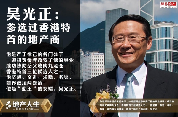 1996年,吳光正曾經(jīng)參加首屆香港特區(qū)行政長官選舉,并為此辭去所有上市公司職務(wù)。但最后在香港特首選舉中落敗,由董建華勝出。吳光正已表示無意再角逐特首職務(wù)。與此共時(shí),他是一個(gè)永遠(yuǎn)低調(diào)人物。是香港著名富豪、老牌船王包玉剛的女婿,原籍浙江慈溪?,F(xiàn)任香港會(huì)德豐(前稱隆豐國際)主席,會(huì)德豐集團(tuán)下控7家香港上市公司,計(jì)有九龍倉、置業(yè)信托、聯(lián)邦地產(chǎn)、連卡佛、香港隧道、寶福集團(tuán)、海港企業(yè);另擁有一家新加坡上市公司馬哥勃羅發(fā)展。 幼年來港,就讀于赤柱圣士提反小學(xué)及中學(xué);其后入俄亥俄州辛辛那提大學(xué)修讀建筑,以繼承父業(yè),但因個(gè)人興趣改讀物理及數(shù)學(xué);接著在美國哥倫比亞大學(xué)攻讀工商管理碩士。畢業(yè)后任職于紐約與香港的美國大通銀行,并與包玉剛次女包陪容結(jié)婚。曾任職紐約大通銀行,九龍倉集團(tuán)有限公司第一副主席,現(xiàn)任隆豐國際投資有限公司、九龍倉集團(tuán)有限公司主席、環(huán)球航運(yùn)集團(tuán)副主席、港美經(jīng)濟(jì)合作委員會(huì)、華美銀行國際顧問委員會(huì)委員、臨時(shí)醫(yī)院管理局和多個(gè)公共事務(wù)委員會(huì)成員、香港電車公司主席、香港基本法咨詢委員會(huì)委員。