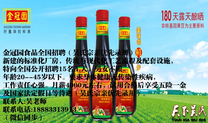 金冠園食品全國招聘(吳氏宗親優(yōu)先錄用)