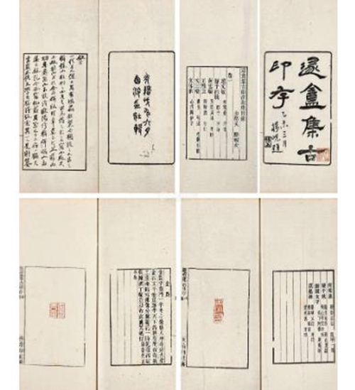《古今楹聯(lián)匯刻》于1900年就鐫刻完成,為擴大影響,吳隱還遍邀當(dāng)時書畫及社會名流題簽或?qū)懶?。先后題簽的有汪鳴鑾、楊文瑩、蔡玉瀛、邵錫元、王同、盛慶藩、笪罣、陳豪、費念慈、厲良玉、嚴(yán)信厚、蒲華、金鑒。寫小傳的有吳榖祥、金爾珍、朱景彝、王錫榮、胡钁、王同烈、陸恢、潘振鏞、王章彤、葉銘、嚴(yán)義彬、朱赮、真周、葉翰仙,還有翁同龢、陶浚宣、吳昌碩署首,俞樾、楊守敬、陶浚宣、嚴(yán)信厚題跋。一時俊賢,俱入?yún)R刻。1906年一經(jīng)正式出版,就風(fēng)行于世,大獲成功。