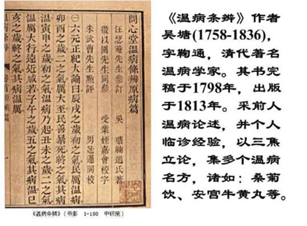 吳鞠通謂前賢之中,元代王履(安道)雖能辨證溫病,但論之未詳;明末吳又可區(qū)分傷寒、溫病,但立法欠精純;清代葉天士立論精細(xì),但立法甚簡(jiǎn),皆未能透達(dá)圓滿。于是吳氏取諸賢精妙,考之《內(nèi)經(jīng)》,參以個(gè)人心得,統(tǒng)論溫病,而成此書?!稖夭l辨》由問心堂初刊于嘉慶十八年(1813年),此后翻印、增批評(píng)注近百次?!稖夭l辨》有多種現(xiàn)代校點(diǎn)本,以道光十六年(1836年)刊本為底本,2007年張志斌以嘉慶十八年(1813年)問心堂初刊本為底本校點(diǎn)出版,收入《溫病大成》一書。吳瑭(1758—1836),字鞠通,淮陰(今屬江蘇)人。19歲時(shí)其父因病而死,傷痛之余,遂廣購(gòu)方書。研讀中見張仲景《傷寒論》序中有“外連榮勢(shì),內(nèi)忘身命”之論,因慨然棄舉子業(yè),專事醫(yī)術(shù)。4年后,其侄子病溫,隨后死于發(fā)黃,這一刺激更堅(jiān)定了吳氏研究溫病的決心。又過(guò)了3年,吳瑭至京師,檢?!端膸?kù)全書》,得覽明季吳又可《溫疫論》,于是專心于溫病診治。經(jīng)過(guò)10年的鉆研,吳氏已有很多心得,但從未敢輕易治療一人。乾隆五十八年(1793年),北京溫疫大行,吳瑭才一展身手,救治了數(shù)十人。長(zhǎng)期的閱讀積累,又經(jīng)過(guò)成功的臨床實(shí)踐,吳瑭開始著書立說(shuō)。嘉慶三年(1798年),吳氏將書初步完成。直到嘉慶甲子年(1804年),吳氏將此書展示給友人徵保。再經(jīng)過(guò)10年,書終告完成,并刊于嘉慶十八年(1813年)。