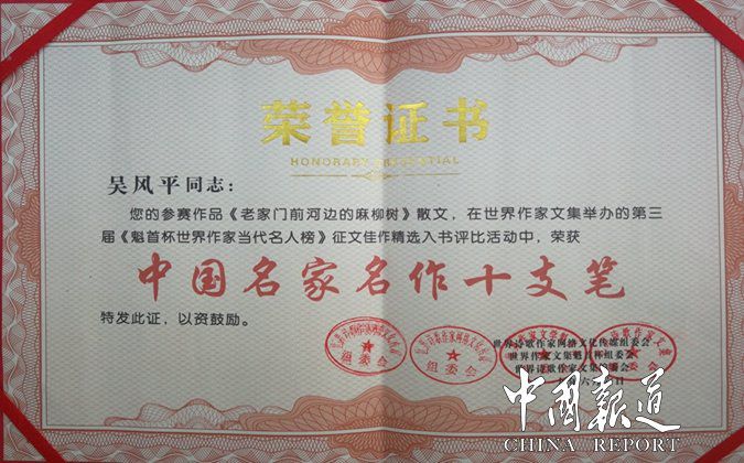 吳風(fēng)平的多項中藥研究成果被授予“天然藥物研究開發(fā)優(yōu)秀成果獎”,《吳氏中風(fēng)偏癱療法臨床應(yīng)用研究》課題榮獲國家衛(wèi)健委“十三五全國重點(diǎn)課題研究一等獎”,其國家發(fā)明專利現(xiàn)已被廣泛運(yùn)用和推廣,出版中醫(yī)藥刊物《吳氏九世中醫(yī)秘驗方精選》、《吳氏中醫(yī)秘驗方精選》、《房事與性病秘驗方集錦》、《吳氏九世中醫(yī)神奇秘驗方》、《中華名醫(yī)驗方精選》、《易經(jīng)正宗》、《易經(jīng)求真》、《易經(jīng)解密》、《小兒推拿》、《腫瘤癌癥的臨床診治》、《針灸臨床運(yùn)用》等專著25部,在國家級醫(yī)學(xué)刊物發(fā)表論文60余篇,親自組織召開“中醫(yī)藥行業(yè)論壇大會”連續(xù)16屆未間斷,他研發(fā)治療糖尿病的特效藥“糖樂健”與“糖樂康”;降壓的“壓必康”;美容祛斑專利產(chǎn)品、雷火神灸、長壽神通袋、至德堂壯骨膏等,其神奇療效轟動醫(yī)療界,臨床三十余年在中醫(yī)藥領(lǐng)域所取得的成果和研發(fā)創(chuàng)新先后獲得國家級榮譽(yù)30多項,行業(yè)榮譽(yù)和社會榮譽(yù)無數(shù)。吳風(fēng)平教還酷愛文學(xué),他利用業(yè)余時間進(jìn)行創(chuàng)作,先后在國家、省、市內(nèi)媒體發(fā)表詩歌,散文、隨筆1500余篇。