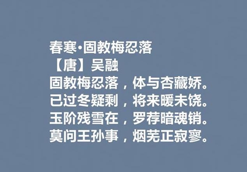 繁紅落盡始凄涼,直道忘憂也未忘。數(shù)朵殷紅似春在,春愁特此系人腸。此詩用忘憂花為題,卻寫滿腹愁腸,吳融的愁思,就在這強(qiáng)烈的對比中,傾泄出來。由此看來,吳融是多愁的,他對于身世飄零,報國無望的悵恨,反映在詩歌上,是將視野收束到自身以及身邊所見所聞的小天地,在這個小天地中,他表現(xiàn)凄涼、淡泊、自嘲、矛盾等情緒。不似李賀因功名不遂又多病苦吟,詩歌表現(xiàn)進(jìn)入「鬼境」。 然吳融自己或因與創(chuàng)作「香奩體」的韓偓同榜,又曾同任翰林,又或許受文壇唯美風(fēng)氣影響,也有一些較為艷麗的作品,如其和韓偓的〈無題〉三首、〈倒次元韻〉等。另外如〈賦得欲曉看妝面〉詩云: