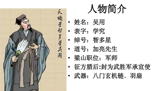 吳用,表字學(xué)究,綽號(hào)智多星,道號(hào)“加亮先生”,是施耐庵所作古典小說(shuō)《水滸傳》中的角色。吳用原本是山東濟(jì)州鄆城縣東溪村私塾先生,但通曉文韜武略,足智多謀,與晁蓋自幼結(jié)交,幫他智取了大名府梁中書給蔡京獻(xiàn)壽的十萬(wàn)貫生辰綱,因此上梁山。后憑借其才華,激林沖火并王倫,又幫助梁山破祝家莊。晁蓋死后幫助宋江坐上梁山寨主并攻破曾頭市、大名府。在梁山處在上升期,收服許多頭領(lǐng)。梁山大聚義后,兩敗童貫、三勝高俅,并推動(dòng)招安進(jìn)程。接受招安后,隨梁山軍隊(duì)南征北戰(zhàn)。平滅了幾方勢(shì)力后,被封武勝軍承宣使。得知宋江被害死后,與花榮一同自縊于楚州南門外蓼兒洼宋江墓前,尸身葬于宋江墓左側(cè)。