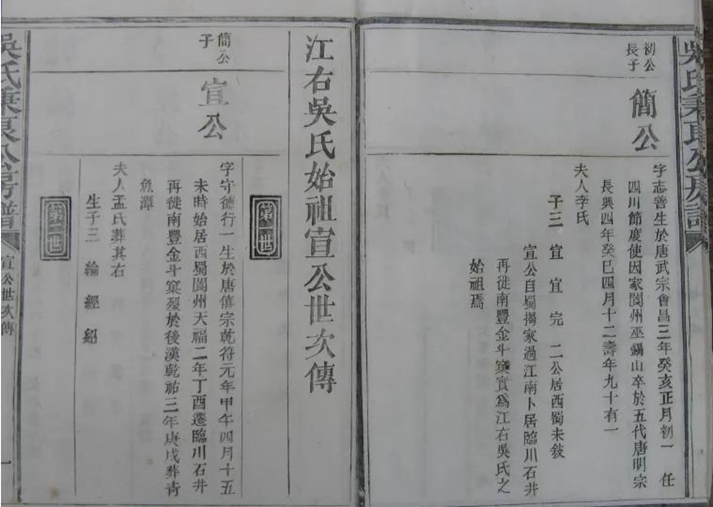 吳氏宣公,字宣城,又字守德,簡公長子生于(874年4月--950年10月)江南吳氏鼻祖,生于唐僖宗乾符元年甲午(874年)四月十五日未時,卒于后漢乾祐三年(950年)。其始祖為周王朝始祖古公亶父的長子泰伯和次子仲雍,姬姓。泰伯、仲雍為讓王位于三弟季歷,斷發(fā)文身逃到吳地,創(chuàng)建了吳國。二十五世之后,吳王夫差被越王勾踐滅國,吳國宗姓子孫以國為姓,改姓吳。吳宣是吳國賢公子季札的第五十三世孫,時居西蜀閬州閬中縣蘭登谷錫山吳登山下,隨父親到西川上任,后娶西川節(jié)度使孟知祥之女,生三子,長子綸,次子經(jīng),幼子紹,18孫77曾孫 360玄孫。