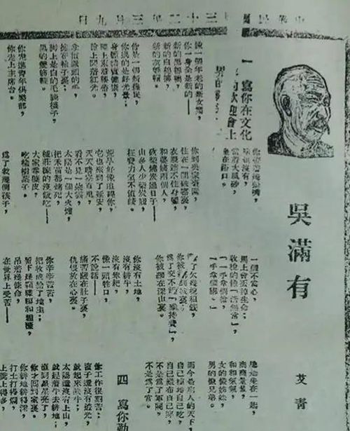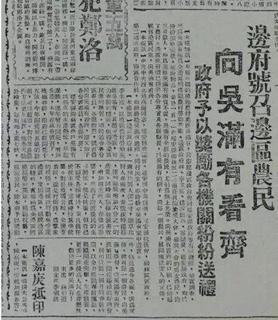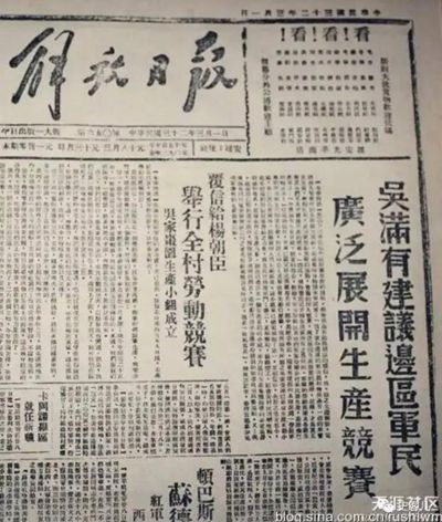 南京《中央日報(bào)》上的吳滿有 1947年3月10日,胡宗南率20萬大軍進(jìn)攻陜甘寧邊區(qū),19日進(jìn)占延安。毛澤東、彭德懷指揮西北野戰(zhàn)軍3萬部隊(duì)與之周旋,先后取得沙家店、羊馬河、青化砭三次戰(zhàn)斗的勝利。青化砭大捷后,陜甘寧邊區(qū)邊區(qū)政府在安塞縣真武洞召開三萬人祝捷大會(huì)。周恩來當(dāng)場宣布毛主席還在陜北,全場一片歡騰,當(dāng)即掀起參軍熱潮。吳滿有身為邊區(qū)參議員、延安南棗園鄉(xiāng)鄉(xiāng)長,集會(huì)上被邀請發(fā)言,他主動(dòng)要求參軍打胡兒子!“胡兒子”,是指國民黨將領(lǐng)胡宗南。