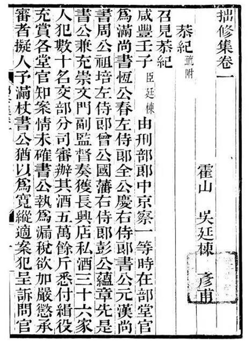 咸豐二年,京察一等。時侍郎書元兼崇文門副監(jiān)督,獲販私釀?wù)呷?,承審者以漏稅擬滿杖。已而覆訊得書元家人詐贓狀,部臣據(jù)以入奏。文宗疑書元孤立,降旨切責,會廷棟召對,上詢是獄。廷棟從容敷奏,且詳陳治道之要,言利之害,君子小人之辨,上首肯,獄竟得解。因詢廷棟讀何書,廷棟以程、朱對。上曰:“學(xué)程、朱者每多迂拘。”對曰:“此不善學(xué)之過。程、朱以明德為體,新民為用,天下未有有體而無用者?;噬献x書窮理,以裕知人之識;清心寡欲,以養(yǎng)坐照之明。寤寐求賢,內(nèi)外得人,天下何憂不治?”上韙之。