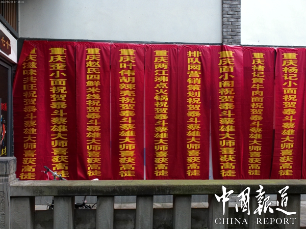 在“天地君親師位”牌下,在大家的共同見(jiàn)證下,周相德隨師傅蔡雄燒香敬祖,后向師傅蔡雄行“三叩九拜”之禮,敬酒敬茶等流程禮成。至此周相德將成為重慶“正東擔(dān)擔(dān)面”第五代傳承人。