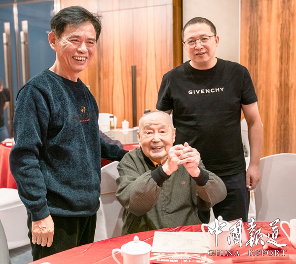 吳新會(huì)長(右)與老會(huì)長吳立興(左)向十多年來為吳氏祖地家譜修繕有杰出貢獻(xiàn)的百歲老人吳壽琦(中)老先生送慰問金