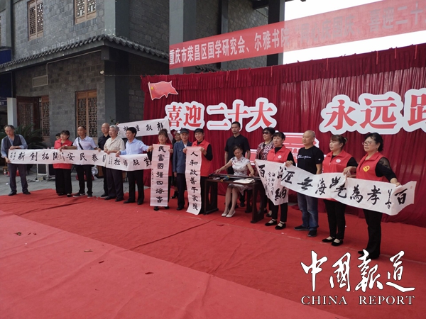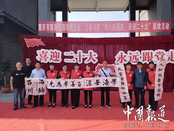中國報道訊(吳蜀豐報道)9月30日,重慶市榮昌區(qū)國學(xué)研究會?爾雅書院在榮昌區(qū)萬靈古鎮(zhèn)萬靈福邸廣場開展了“同心慶國慶、喜迎二十大”聯(lián)歡活動。本次活動由榮昌區(qū)文化和旅游發(fā)展委員會指導(dǎo),榮昌區(qū)國學(xué)研究會主辦,榮昌區(qū)國學(xué)研究會爾雅書院承辦,重慶爾雅清風(fēng)文化傳媒有限公司,榮昌區(qū)知行社工服務(wù)中心,榮昌區(qū)學(xué)院路小學(xué),榮昌區(qū)棠香小學(xué),榮昌區(qū)高新區(qū)實驗小學(xué),榮昌區(qū)紅蘋果美德幼兒園,榮昌區(qū)蘇家拳武館,榮昌區(qū)騰達(dá)功夫搏擊館,重慶自然坊生態(tài)農(nóng)業(yè)科技有限公司,重慶市榮昌區(qū)藝鄉(xiāng)燈飾城為本次活動協(xié)辦單位。