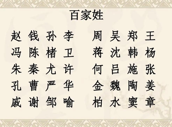 《百家姓》與《三字經(jīng)》、《千字文》并稱“三百千”,是中國古代幼兒的啟蒙讀物。“趙錢孫李”成為《百家姓》前四姓是因為百家姓形成于宋朝,故而宋朝皇帝的趙氏、吳越國國王錢俶、正妃孫氏以及南唐國主李氏成為百家姓前四位。