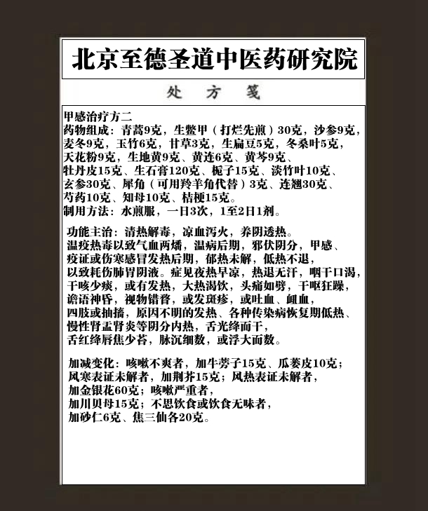 藥物組成:青蒿9克,生鱉甲(打爛先煎)30克,沙參9克,麥冬9克,玉竹6克,甘草3克,生扁豆5克,冬桑葉5克,天花粉9克,生地黃9克、黃連6克、黃芩9克、牡丹皮15克、生石膏120克、梔子15克、淡竹葉10克、玄參30克、犀角(可用羚羊角代替)3克、連翹30克、芍藥10克、知母10克、桔梗15克。