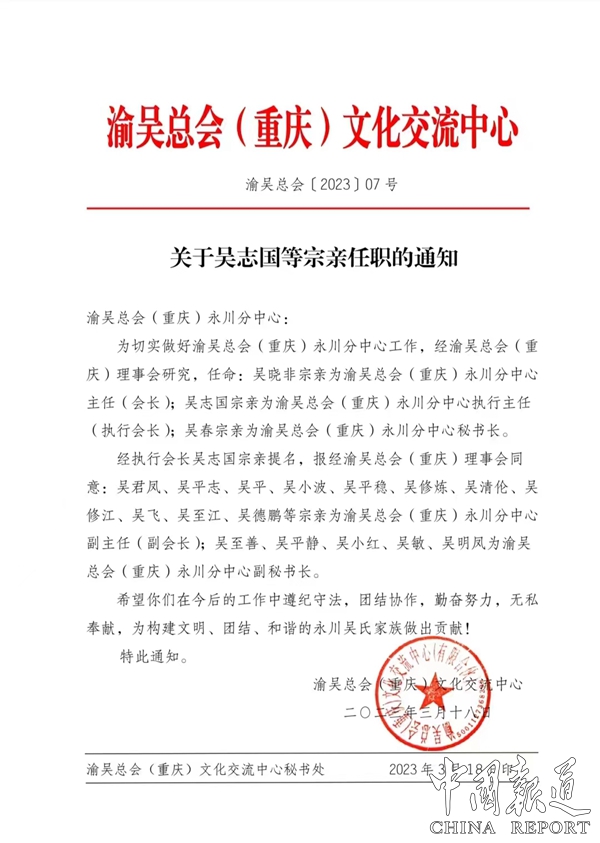 中國(guó)報(bào)道訊(吳蜀豐報(bào)道)3月19日,渝吳總會(huì)(重慶)文化交流中心永川分中心正式掛牌成立,來自大足區(qū)、銅梁區(qū)、南岸區(qū)、巴南區(qū)、南川區(qū)、渝北區(qū)及豐都縣等地的分中心負(fù)責(zé)人參加本次活動(dòng)。重慶吳氏集團(tuán)董事長(zhǎng)、渝吳總會(huì)(重慶)文化交流中心會(huì)長(zhǎng)吳世平在成立會(huì)上發(fā)言致辭。