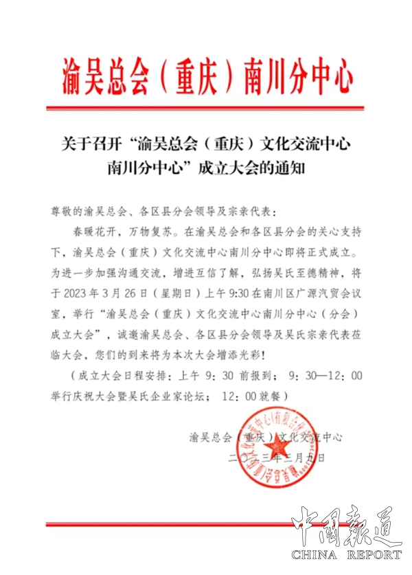 中國報道訊(吳蜀豐報道)3月26日,渝吳總會(重慶)文化交流中心南川分中心正式掛牌成立,來自渝吳總會大足區(qū)、銅梁區(qū)、南岸區(qū)、巴南區(qū)、南川區(qū)、渝北區(qū)及豐都縣等地的分中心負責人參加本次活動。