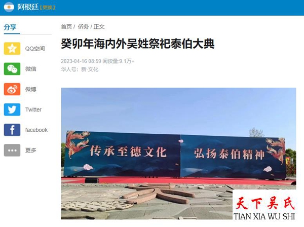 天下吳氏網(wǎng)訊(新加坡工作站吳文軍報(bào)道)4月10日,在江蘇省無(wú)錫市舉辦的泰伯祭祀大典 。海內(nèi)外吳姓參加祭祀泰伯大典,表達(dá)對(duì)江南人文始祖泰伯的追思緬懷之情和共鑄民族精神譜寫(xiě)江南新篇章的豪邁情懷。