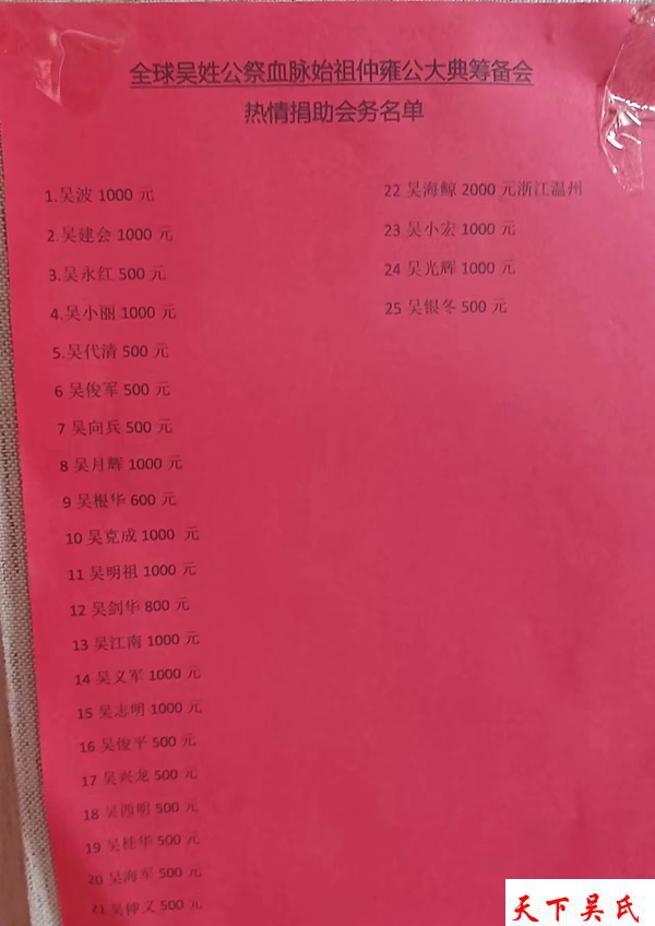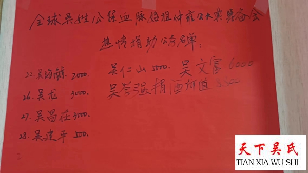 天下吳氏網(wǎng)江西工作站站長(zhǎng)吳美福說(shuō):一個(gè)家族祭祖是血脈親情 吳氏祭祀仲雍是歷史傳承。在江西宜春倡議召開(kāi)祭血脈始祖仲雍公大典及祭祀常態(tài)化是意義重大,影響深遠(yuǎn)!此次籌備會(huì)由吳海鯨發(fā)起捐款,吳文富、吳仁山、吳學(xué)強(qiáng)、吳龍、吳世平、吳紅、吳敬軒與本地宗親捐款有近3萬(wàn)6千元左右,吳學(xué)強(qiáng)捐酒價(jià)值8800元。