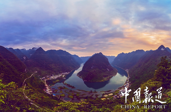 從天下第一銅鼓玻璃棧道上,目所能及河道長約4公里,河面寬300米,兩岸高山聳立,直插云天,與水面高差數(shù)百米。這里一年四季景色各異,同一日里的景象也是變幻莫測。最經(jīng)典的景象或是云霧纏繞聚散,或是紅霞漫天,或是雨過天晴彩虹飛度……蔚為壯觀,是尋奇、覽勝、探幽難得的景觀。兩岸一個個如青如黛的山巒,沿著紅水河排列成銳意前進(jìn)的陣容,集雄偉、瑰麗、神奇于一體,云濃霧密,莽莽蒼蒼。如詩如夢的風(fēng)景,無須刻意探尋,就是一幅靜謐和諧、難于名狀的山水畫。那醉人的綠,綠得讓你不知身處何方,那畫既在眼前,又在心里,到處都是一派恬美舒適的風(fēng)光,人在畫中走,船在景中行,一派人間仙境。站在銅鼓玻璃棧道上,猶如置身半空,眼前山川河流云霧繚繞,感覺身在其中觸手可及,可以一覽“紅水河第一灣”全景。站在銅鼓棧道上向下望,那道巨大的水灣盡收眼底。美麗靜謐的江水,沒有咆哮,沒有奔騰,只有悠長,只有恬靜,紅水河宛若一條玉帶,從群山中走來,在綠意蔥蘢的青山間打了個大轉(zhuǎn)彎,又向群山中走去。千變?nèi)f化的霧,每時每刻都有在變化著,在眼前飄過,一會兒分散,一會兒聚攏,一會兒徐徐上升,一會兒滾滾向前。人似乎在空中騰云駕霧,亦如神仙在云里霧里穿行。2020年紅水河第一灣流域先后被定為”國家森林公園”、”國家森林康養(yǎng)基地”,2020年7月紅水河天下第一彎景區(qū)被評為國家4A級旅游景區(qū)。