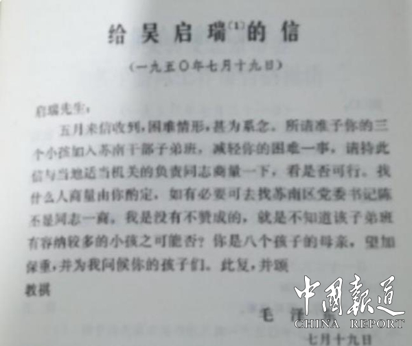毛主席不但同意了吳老師送3個小孩入蘇南區(qū)干部子女班的申請,提供了解決辦法,還一再強調(diào)“你是八個孩子的母親,望加保重”,要吳老師“為我問候你的孩子們”,文字平實,卻是情深意厚。其實,照顧3個小孩入蘇南區(qū)干部子女班,毛主席只需打一個電話,或交代給秘書去辦,就可以解決了。但毛主席對待來自親友、同窗、烈屬等求助,始終堅持一個原則:絕不干涉地方政府行政。因此,他建議吳老師拿他的親筆信找當?shù)夭块T解決。