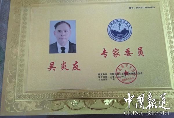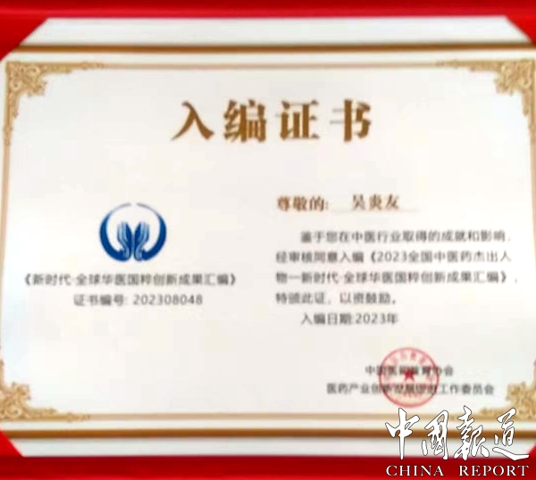 中國(guó)報(bào)道訊(吳蜀豐報(bào)道)近日,廣西平南縣同和鎮(zhèn)吳炎友收到來(lái)自中國(guó)民族衛(wèi)生協(xié)會(huì)和中國(guó)醫(yī)藥教育協(xié)會(huì)醫(yī)藥產(chǎn)業(yè)創(chuàng)新發(fā)展促進(jìn)工作委員會(huì)頒發(fā)的證書(shū),內(nèi)容如下,入編證書(shū):尊敬的吳炎友:鑒于您在中醫(yī)行業(yè)取得的成就和影響,經(jīng)審核同意入編《2O23全國(guó)中醫(yī)藥杰出人物一新時(shí)代全球華醫(yī)國(guó)粹創(chuàng)新成果匯編》特頒此證,以資鼓勵(lì)。