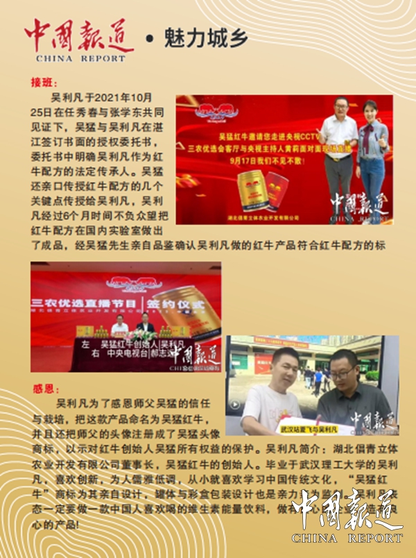 我來(lái)自英雄的城市湖北武漢,畢業(yè)于武漢理工大學(xué)。楚山楚水楚天闊,大江大水大武漢,這里培育了一代又一代的敢為人先的革命英雄,也培養(yǎng)出各行各業(yè)的企業(yè)家人才,我們生在這個(gè)和平年代,就在這個(gè)企業(yè)產(chǎn)品上面,做了一些突破,做出了一款屬于中國(guó)人自己的紅牛,吳猛紅牛。 我姓吳,我的大哥叫吳猛,是我大哥培養(yǎng)了我,也教育了我,我作為他的徒弟,又是他的接班人,我為了感恩我大哥,就把這款紅牛,命名為吳猛紅牛,我們還以我大哥的頭像注冊(cè)了吳猛頭像商標(biāo)。這個(gè)有兩個(gè)好處,第一個(gè)保護(hù)好我們產(chǎn)品知識(shí)產(chǎn)權(quán),第二個(gè)是讓消費(fèi)者好識(shí)別我們的產(chǎn)品真假,以后一看到吳猛頭像的吳猛紅牛就是中國(guó)人自己的。