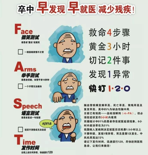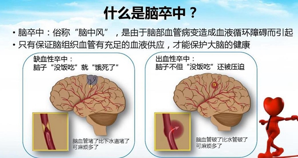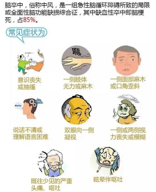 什么是中風(fēng)?中風(fēng)也稱卒中,是一種急性腦血管疾病,是由于腦部血管突然破裂,或因血管阻塞導(dǎo)致血液不能流入大腦,而引起腦組織損傷的疾病。沒有血液和氧氣供應(yīng),缺血部分的腦組織就會(huì)出現(xiàn)壞死。壞死腦組織支配的軀體部分就會(huì)出現(xiàn)功能異常。