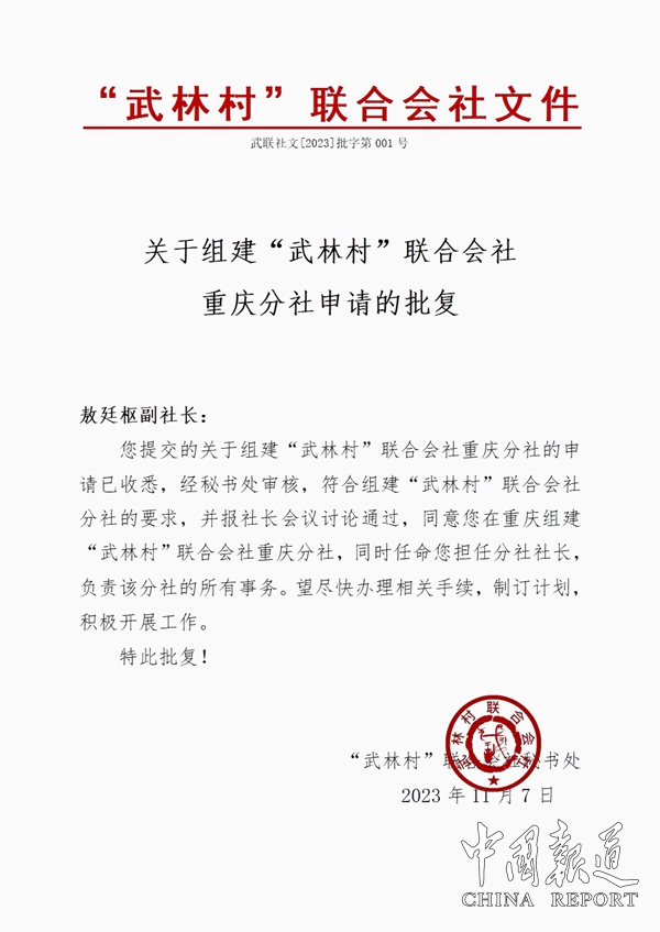 中國(guó)報(bào)道訊(吳蜀豐報(bào)道)11月7日,根據(jù)一指門(mén)創(chuàng)立人、武林村聯(lián)合會(huì)社副社長(zhǎng)敖廷樞的申請(qǐng),經(jīng)武聯(lián)社秘書(shū)處審核,提交社長(zhǎng)會(huì)議討論通過(guò),同意在重慶設(shè)立武聯(lián)社重慶分社,并任命敖廷樞為重慶分社社長(zhǎng),全權(quán)負(fù)責(zé)分社建立及工作開(kāi)展。