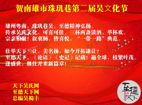 雄州粵南 珠璣巷吳,至德精神弘揚(yáng)。傳承吳氏文化,可喜可佳。三杯兩盞淡酒,舉杯歡。宗親相聚!敘衷腸,皆喜悅,“一帶一路”典范。壯舉天下三讓,美名揚(yáng),如今開(kāi)拓謙讓?至德天下,《論語(yǔ)》《史記》記載!遍全球,枝繁葉茂。逢盛世,繼往開(kāi)來(lái)新篇章!
