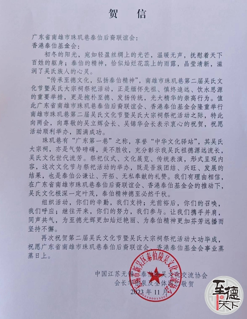 值此深秋之際,我代表無(wú)錫市吳文化研究會(huì)在遙遠(yuǎn)的無(wú)錫祖地,向您們表達(dá)我們誠(chéng)摯的祝福和敬意。我們欣聞?東省南 雄市珠璣巷百姓堂由南雄市珠璣巷泰伯后裔聯(lián)誼會(huì)、?港泰伯基?會(huì)聯(lián)合舉辦南雄市珠璣巷第?屆吳??化節(jié)暨吳??宗祠祭祀活動(dòng)即將拉開(kāi)帷幕,此刻的喜悅與激動(dòng),難以用言語(yǔ)來(lái)形容。