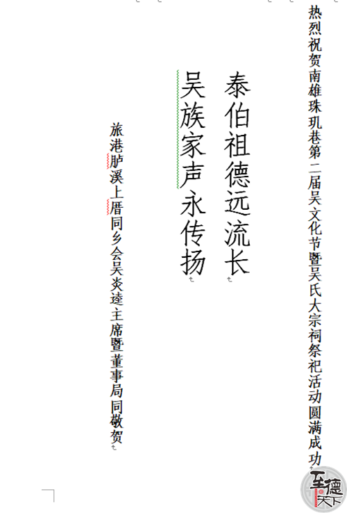 祝南雄市珠璣巷泰伯后裔聯(lián)誼會(huì)、香港泰伯基金會(huì)繁榮昌盛! 祝愿南雄珠璣巷第二屆吳文化節(jié)慶典活動(dòng)圓滿成功!