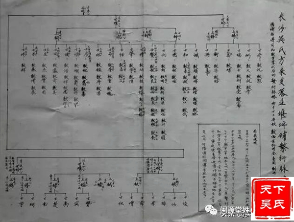 《吳氏族譜》載,這一支長(zhǎng)沙吳氏是季札一脈相傳的后裔,漢唐以來(lái),代有聞人。始太祖豐城公固世姓吳,是元末隱君子,世居江西豐城,故稱之為豐城公。豐城公有二子,長(zhǎng)子開(kāi)宏,字佐昌,元末太學(xué)生,是吳氏一世始遷祖;次子開(kāi)敏,字倚正,翰林學(xué)士。明初洪武二年(1369)佐昌公(吳開(kāi)宏)始遷湖南長(zhǎng)沙,落業(yè)善化縣冷木沖,傳大路房、柳沖房、高塘房、高橋壩房、金井塘房五房人。