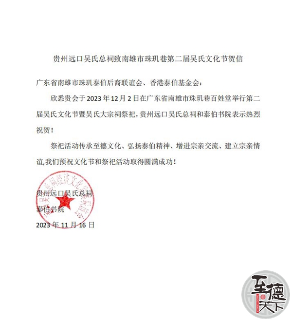 欣悉貴會于2023年12月2日在廣東省南雄市珠璣巷百姓堂舉行第二屆吳氏文化節(jié)暨吳氏大宗祠祭祀,貴州遠口吳氏總祠和泰伯書院表示熱烈祝賀!