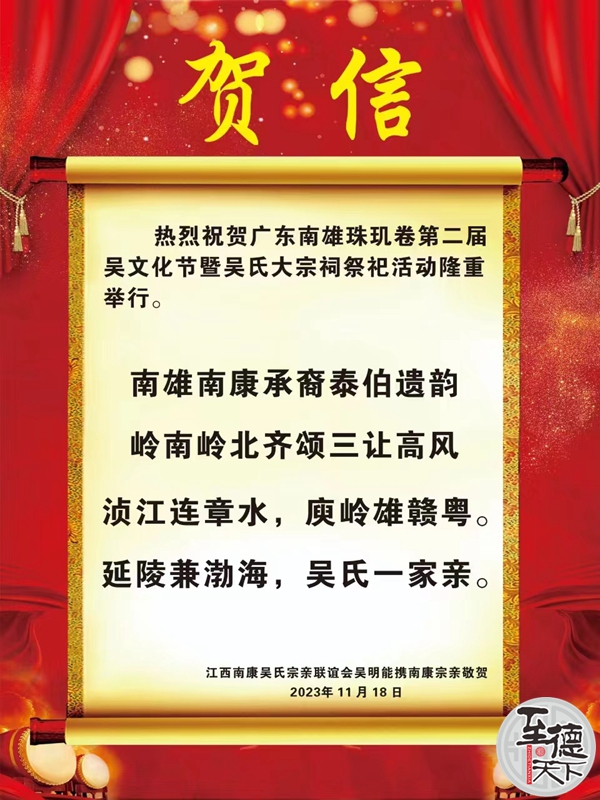 江西南康吳氏宗親聯(lián)誼會致南雄第二屆吳文化節(jié)賀電