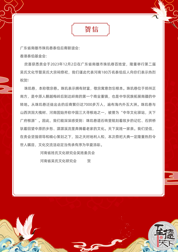 河南省吳氏文化研究會(huì)致南雄第二屆吳氏文化節(jié)賀信
