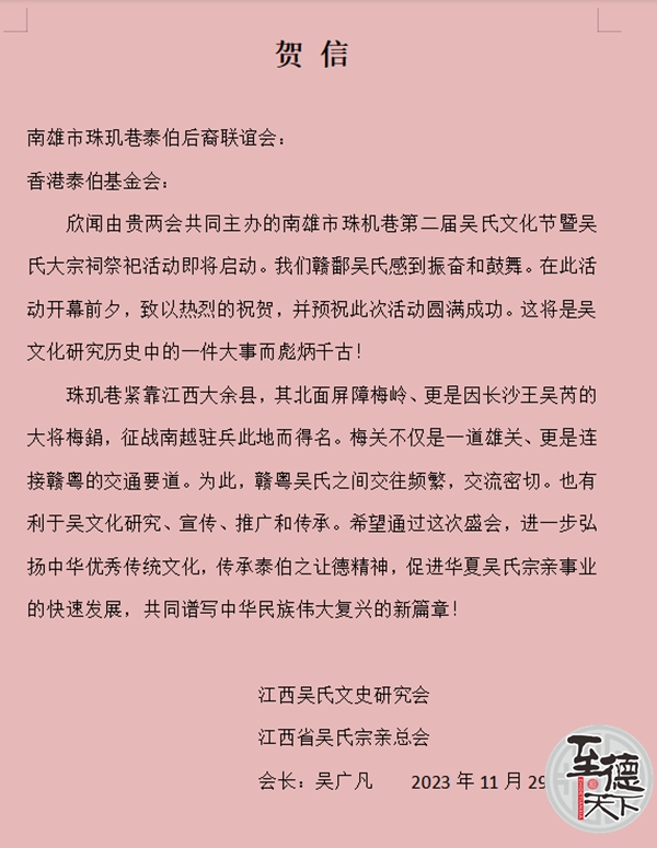 江西吳氏文史研究會致南雄第二屆吳文化節(jié)賀信