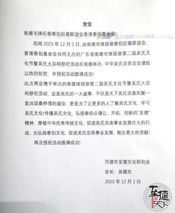 河源市至徳文化研究會致南雄第二屆吳文化節(jié)賀信