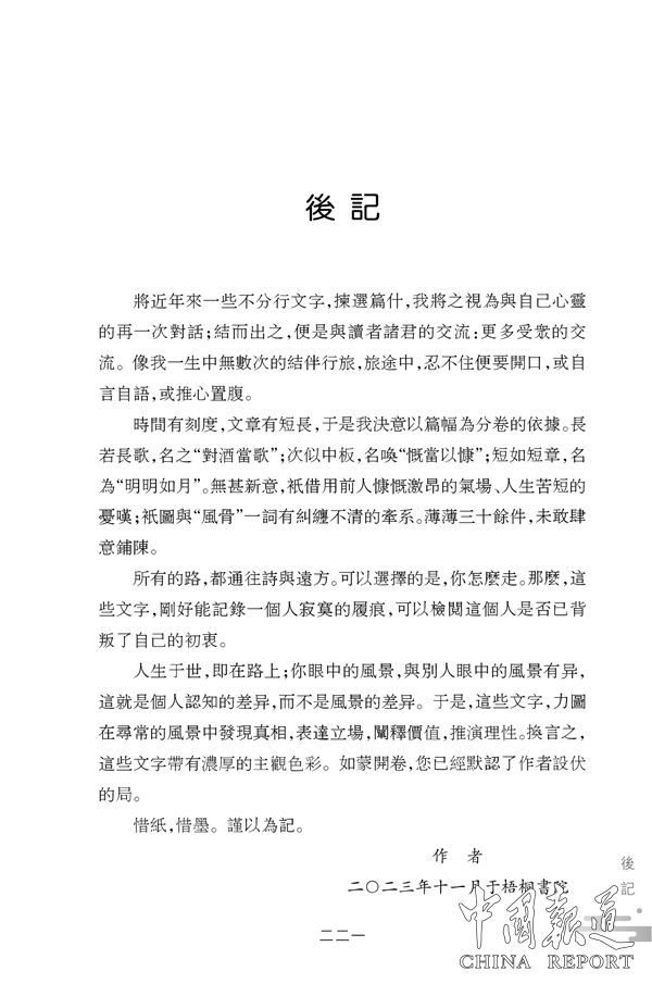 吳謹(jǐn)程在后記中說(shuō):“人生于世,即在路上,你眼中的風(fēng)景,與別人眼中的風(fēng)景有異,這是個(gè)人認(rèn)知的差異,而不是風(fēng)景的差異。于是,這些文字,力求在尋常的風(fēng)景中發(fā)現(xiàn)真相,表達(dá)立場(chǎng),闡釋價(jià)值,推演理性。”是否可以這樣理解:吳謹(jǐn)程企圖以這些文字,凸顯自己所謂的傲然風(fēng)骨?