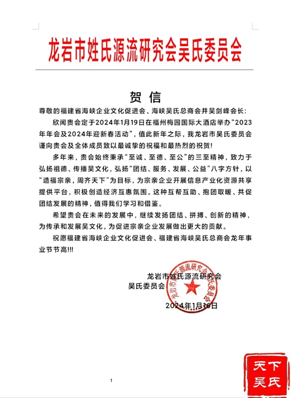龍巖市姓氏文化源流研究會(huì)吳氏委員會(huì)致海吳總會(huì)賀電