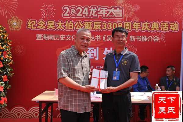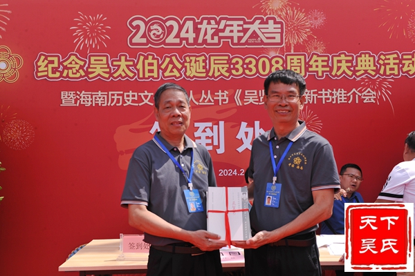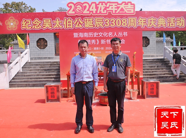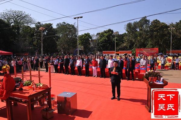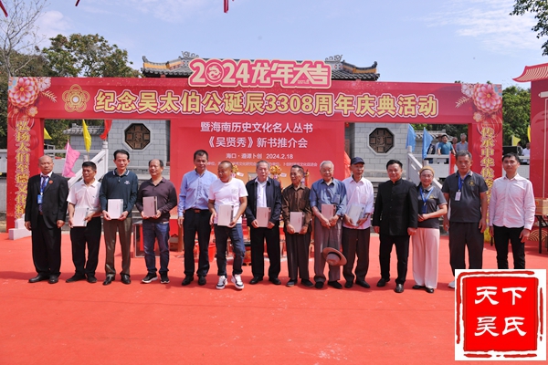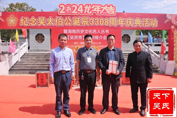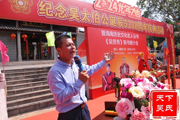 天下吳氏網(wǎng)訊(海南工作站吳乾山報(bào)道)2月18日上午,由海口市吳賢秀文化研究會(huì)主辦;卜創(chuàng)村吳氏宗親會(huì)協(xié)辦的紀(jì)念泰伯公誕辰3308周年暨海南歷史文化名人叢書(shū)《吳賢秀》新書(shū)推介會(huì)在??谑旋埲A區(qū)遵譚鎮(zhèn)卜創(chuàng)村隆重舉行。特邀嘉賓:央媒《小康》雜志海南站副主任吳國(guó)輝;中共海南省委黨校圖書(shū)館原館長(zhǎng)吳原木;海南大學(xué)圖書(shū)館副館長(zhǎng)石曉巖博士;海南師范大學(xué)教研室主任吳春秋博士;海南省委黨校教師、巜吳賢秀》作者吳明日碩士;海南農(nóng)校吳清華教授;老吳臺(tái)集團(tuán)、貴州吳文化研究委員會(huì)主席吳學(xué)強(qiáng);來(lái)自海口市吳賢秀文化研究會(huì)名譽(yù)會(huì)長(zhǎng)吳川富、吳清東、榮譽(yù)會(huì)長(zhǎng)吳名揚(yáng);會(huì)長(zhǎng)吳林橋;監(jiān)事長(zhǎng)吳和春;常務(wù)副會(huì)長(zhǎng)吳敦壯、吳孝權(quán)、吳坤導(dǎo),吳坤清;副會(huì)長(zhǎng)吳雄興、吳淑波、吳建良、吳應(yīng)明、吳明海、吳天慶、吳多釗、吳坤強(qiáng)、吳李金倪、吳群以及吳志、吳寧、吳忠、吳青鴻、吳岳漢、吳文良、吳大才、吳漢周、吳森等等??诘貐^(qū)吳氏各村:卜創(chuàng)村、美秋村、松村、山園村、鳳凰村、安久村、美目村、坊門(mén)村、遵榔村、咸涼村、儒棟村、儒匏村、儒升村、本用村、典讀村、儒吳村、儒圣村、蛟龍村、美盈村、托村、仁里村、美萬(wàn)村、儒全村、龍玩村、龍啟嶼村、群修村、定文村、儒佐村、仁太村、卜創(chuàng)新城、翰香村、儒櫟村、東堡、儒黎村、昌旺村、雅詠村、道貢村、涵泳村等1200多人參加紀(jì)念活動(dòng)。